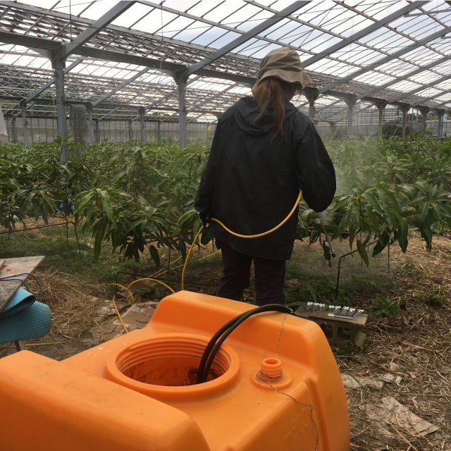 2枚目の写真は、無農薬栽培マンゴー園に忌避剤を散布している様子です。忌避剤と言っても有機JAS認定の資材で、食用アミノ酸などが主成分ですので、安心安全ですよ。(‘◇’)ゞ
