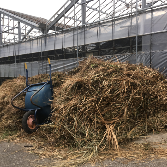 幸いにして朝雲ファームでは、第1ハウスの横に遊休地があり、そこで刈り取った雑草をある程度日干しし、乾燥させた上にできるだけ細かく裁断して投入しています。