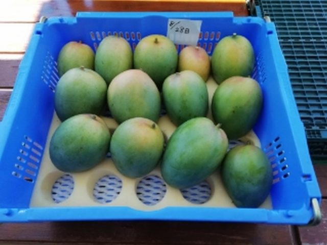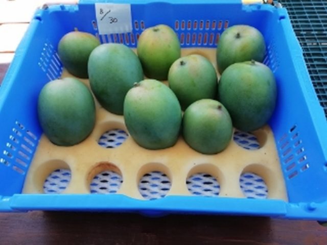 写真の青カゴに日付が書いてある理由は、キーツマンゴーは追熟型品種であるためで、収穫してからしばらく常温で追熟させるために、日付管理している訳ですね。