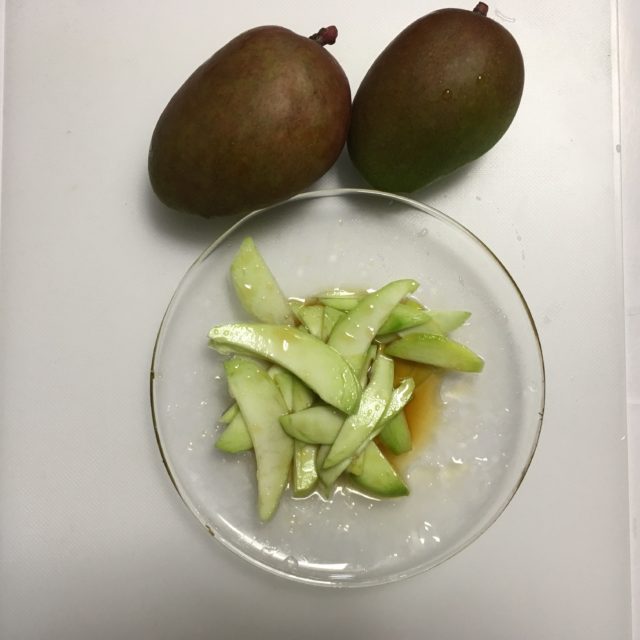 上の写真は摘果したマンゴーです。小さいのから少し大きくなったものまであります。無事に育ってくれてありがとうと言いながらカットしていきます。美味しいマンゴーを育てるためには必要な作業ですからね。感謝を込めてちゃんといただきます。