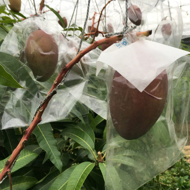 果実が大きくなってくるとより日に当たるように吊り直し、無農薬栽培ですから1玉1玉ふきふきして、虫君対策に袋掛けを行っています。美味しそうなこんがりマンゴーになるまでに必要なら何回も行います。大きくなってきた果実を見ていると、とても嬉しくてウキウキ作業していますよ。(*^▽^*)