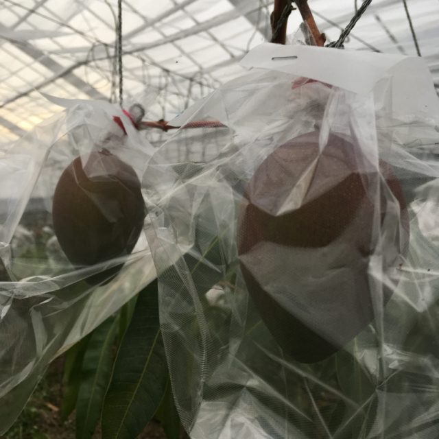 今日の写真の果実がアーウィン種のマンゴーで、今の時点での大きさは250g~300gで、今後、完熟自然落下するまでの間に(約40日後)さらに成長し、収穫時には350g~450gのふっくらとした真っ赤かのこんがりとした果実になります。