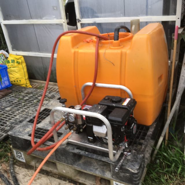 私たち農園では、化学農薬を一切使わずに、マンゴーを栽培しているため、防除作業の方法は主に、捕殺、虫取りシート、そして、写真にあります動力噴霧器を使い、忌避剤を水に薄めて、水圧で虫君などを吹っ飛ばすという原始的な、地道な作業を行っていますよ。(´艸`*)